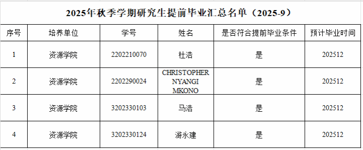 根据学校的相关通知要求,经研究生个人申请,学院初审,雷竞技官网在线2023级硕士研究生(不含硕博连读、提前攻博研究生)、2022级博士研究生(不含直博生)、2020级直博生申请提前毕业名单如下,如有异议,请公示期内书面反馈意见至研究生科(联系人:周老师,办公室:主楼336,电话:67883627),公示期即日起至2025年9月22日。